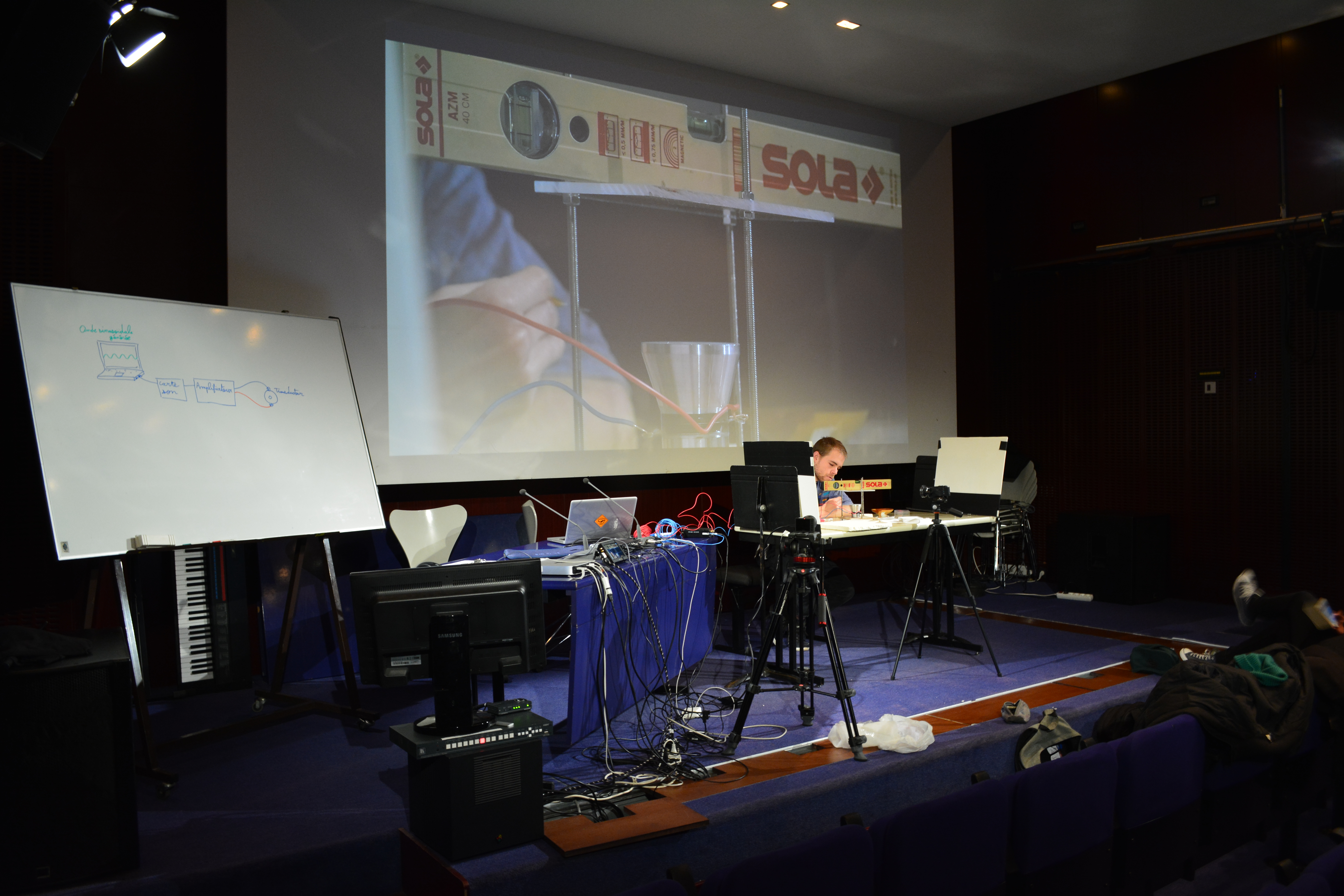 Il est bientôt midi nous devons quitter la salle. Nous retournerons au LAM mardi 4 avril pour effectuer d’autres tests. Il nous faudrait un fond noir pour les photos/vidéos, une règle graduée pour l’échelle des images, essayer de faire léviter de l’eau et des plus petits objets pour mieux voir le « saut » due à la variation de fréquence. Nous aimerions pouvoir comprendre correctement ce décalage due à cette variation.