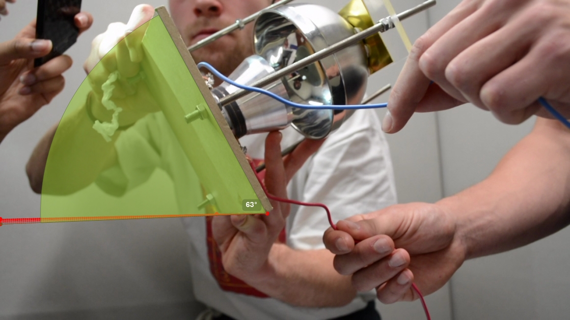 Avec le réflecteur plan en laiton la bille se désaxe et tombe du système lorsque l’angle de rotation, mesuré avec Kinovea est d'environ 14°. Au-delà de 14° la bille de polystyrène tombe car le poids n'est plus compensé par la force […]. Il faut noter que la trame rouge est une trame servant de repère de précision pour palier aux problèmes de perspective et d'angle de caméra lors de la prise de vue. Il en va de même pour le réflecteur concave en inox :