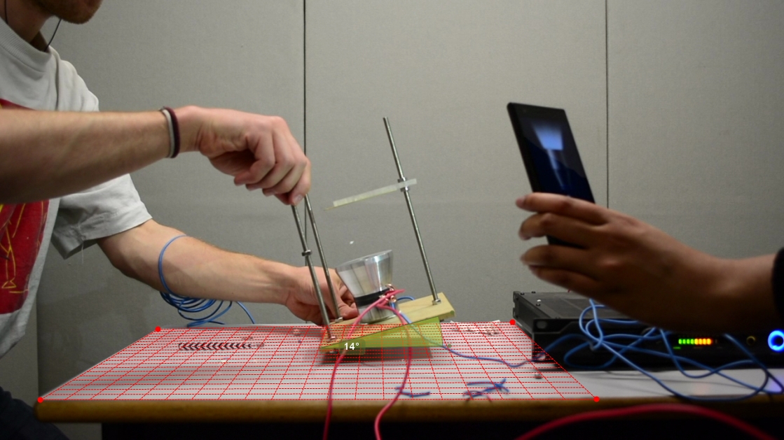 Nous avons commencé par envoyer une onde sinusoïdale ultrasonore générée par l’ordinateur. Le problème c’est que nous ne savions pas avec exactitude la fréquence envoyée, le logiciel (Ableton Live) ne le précisant pas. Nous nous sommes rendu compte dès le début qu’il y avait une force statique due au plexiglas (réflecteur) qui agissait sur notre petite bille de polystyrène lorsque nous l’approchions trop près. Nous avons donc fait les tests plus proches du transducteur.   Nous avons passé 1h à effectuer des tests, en faisant varier:
