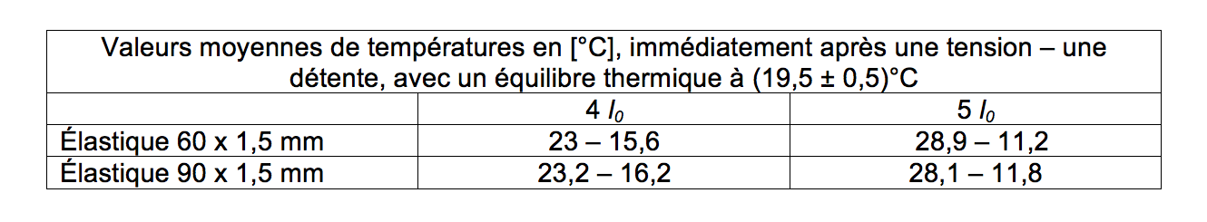 La température de la pièce (thermostat) était de (19,5 ± 0,5)°C. Ci-dessous un tableau comparatif des valeurs moyennes que l'on a pu obtenir pour les deux élastiques et deux élongations.