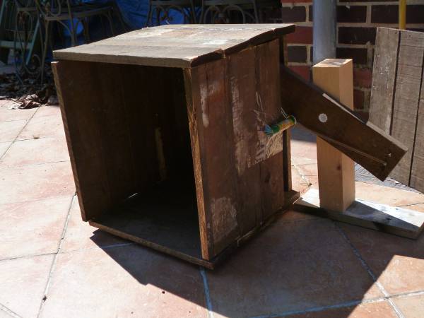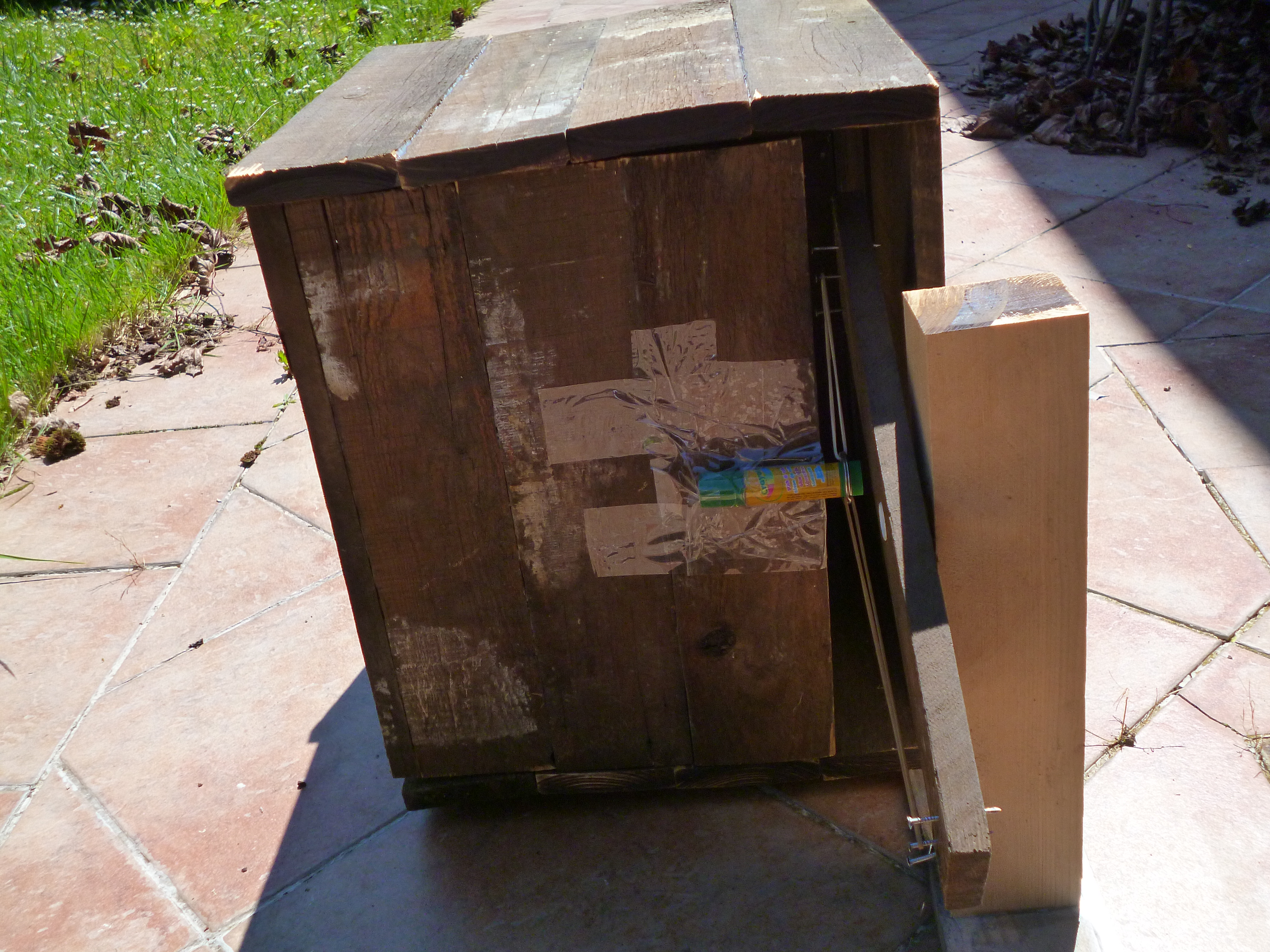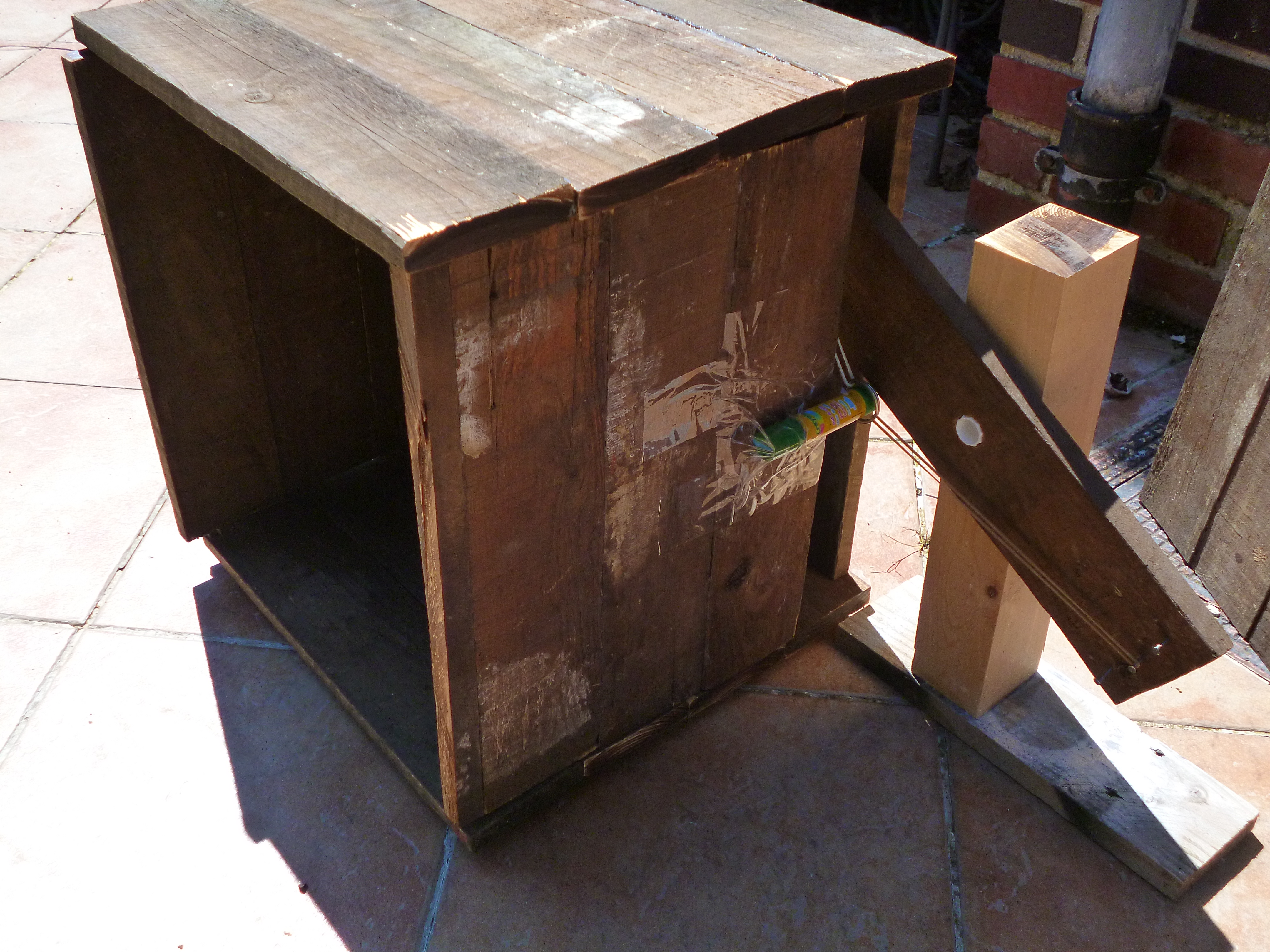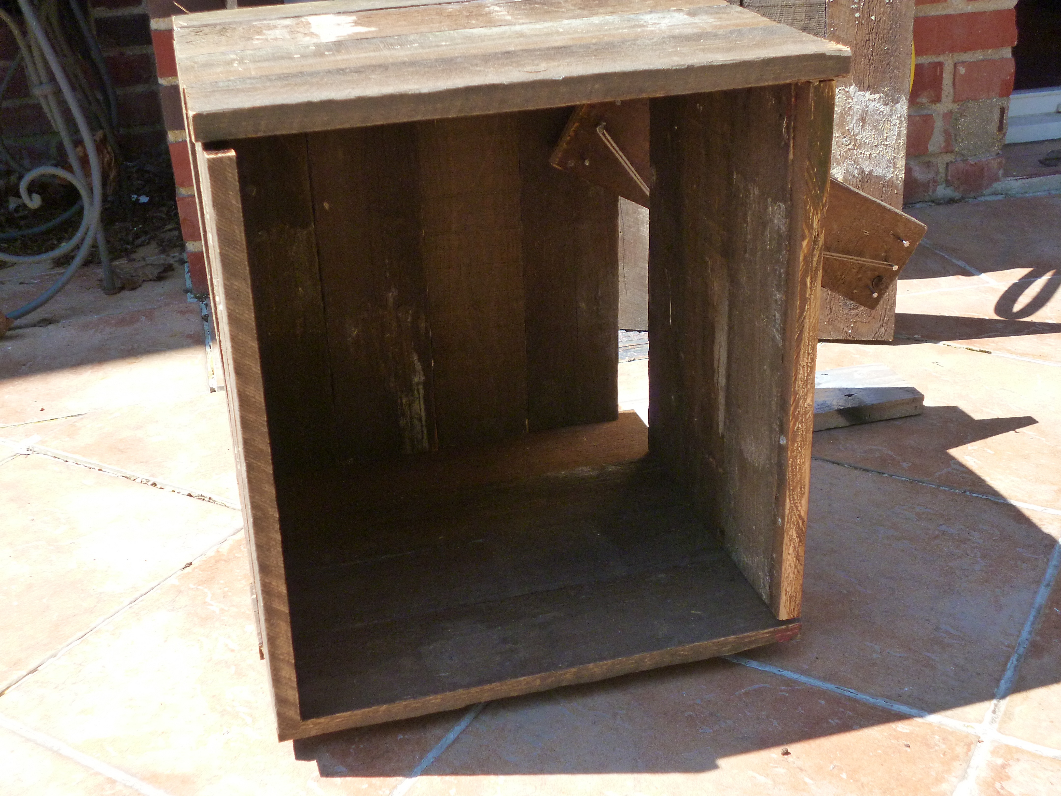 L'enceinte sera finalement fabriquée à partir de matériel de récupération. De longues planches de bois relativement identiques sont découpées à la scie circulaire en 24 blocs de 40 x 9 x 2 cm. Pour former les murs de la machine, ces blocs sont assemblés par 4 à l'aide de colle à bois : les surfaces à coller sont d'abord poncées afin d'optimiser l'adhérence de la colle. Nous attendons que la roue soit fabriquée avant de calculer la taille de la fente nécessaire à son passage. Ainsi, l'enceinte du réfrigérateur aura sera un cube de 40 x 40 x 40 cm, avec un volume interne de 36 x 36 x 36 cm (les parois ayant une épaisseur de 2 cm), que l'on peut voir ci-dessous. Les trous dus aux irrégularités des planches seront comblés au mieux. Il est prévu d'ajouter 2 cm d'épaisseur de laine de verre, pour un volume interne final de 34 x 34 x 34 cm (N.B. : nous ne le ferons pas en pratique, n'ayant pas d'outils pour faire de mesures, la construction du prototype est purement démonstrative, il n'est pas utile d'utiliser un matériau facultatif et “précieux”).