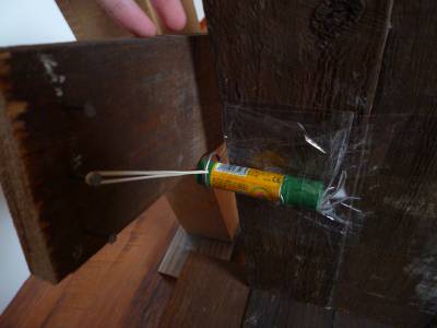 Comme dit précédemment, nous utiliserons un tube de colle pour faire pivoter la roue, notre système pouvant inverser son sens de rotation lors d'un temps d'homogénéisation (arrêt de la roue) sans que cela ne pose problème : c'est parce qu'elle n'a pas besoin de tourner sans interruption que cette solution est possible. Le centre de la planche-roue est percé d'un trou de 2 cm de diamètre puis limé pour que la base du tube de colle (2,1 cm de diamètre) y rentre. Cet assemblage roue/colle est monté sur un socle en bois assez épais et lui aussi percé pour incruster le reste du tube de colle. Sur les images 8,9 et 10 vous pourrez voir le socle qui maintient la planche-roue et lui permet de tourner (image 8), troué en un point pour accueillir l'arrière de la planche-roue associée au tube de colle (image 9), et les deux pièces assemblées (socle + roue liés par le tube de colle, image 10).