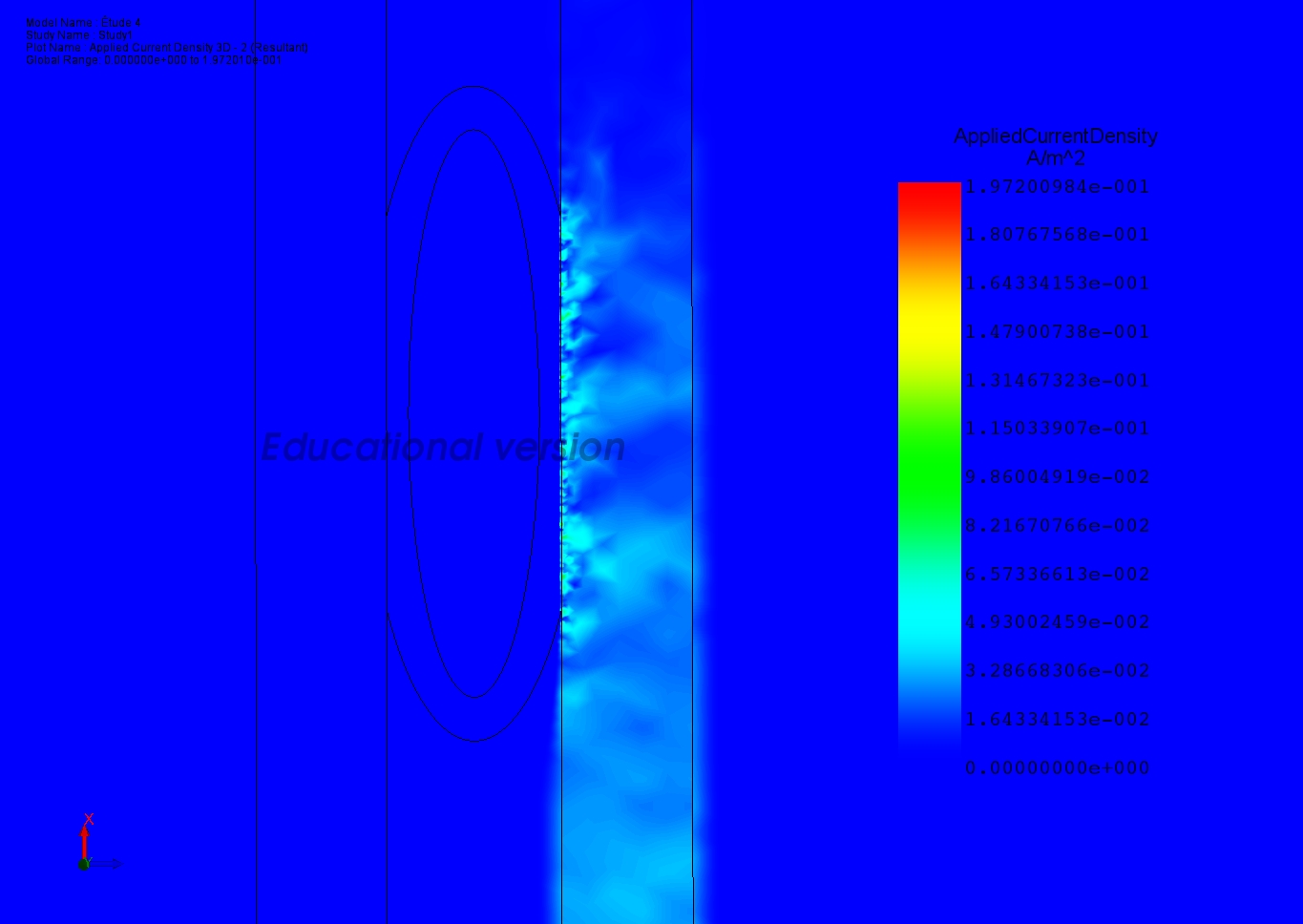Ayant pris un peu d'expérience après avoir fait les premières simulations nous nous lançons à réaliser une première étude complète du railgun avec une géométrie approchée du premier projectile que nous avions utilisé. Cette simulation étant beaucoup plus complexe vise à nous donner en plus des valeurs liées au champ magnétique, la densité de courant en tout point du système ainsi que la force subie par le projectile. Finalement, nous pourrions en théorie faire une étude thermique en supposant que le système dissipe de l'énergie par rayonnement et par convection dans une pièce à 300K. Nous obtenons alors l'allure du champ magnétique et de la densité du système avec les contraintes choisies. Nous constatons alors qu'on a sûrement besoin d'adapter les contraintes du système pour avoir une meilleur simulation. En effet, la représentation tridimentionnelle de la densité de courant nous montre que celui-ci a du mal a pénétrer à l'intérieur du projectile. Voici quelques images obtenues: