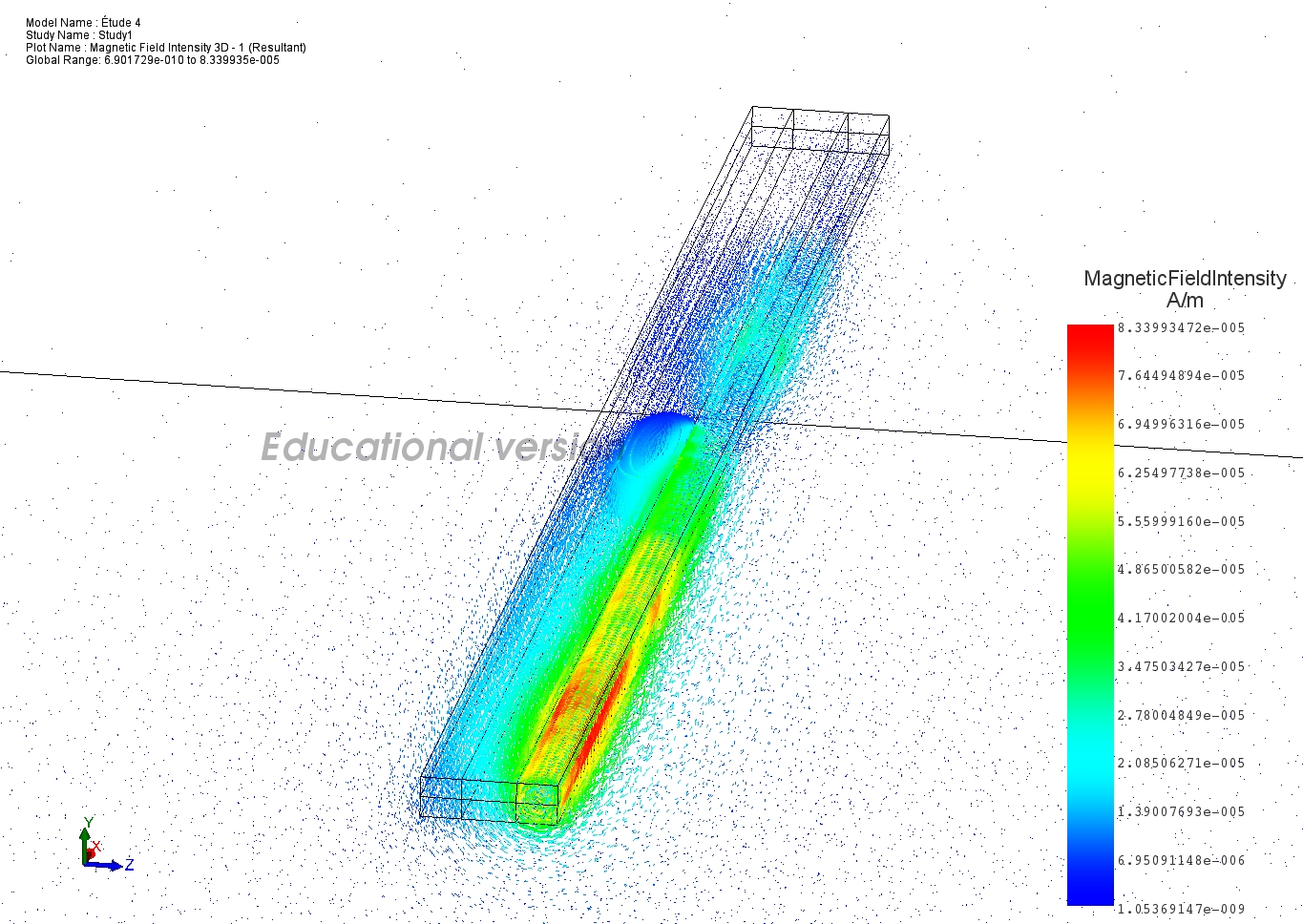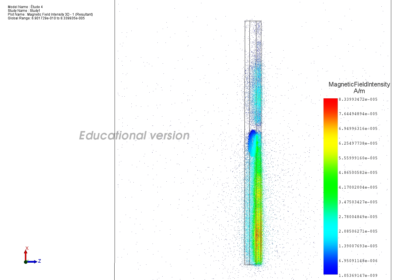 Nous obvervons alors dans l'image de gauche l'allure du champ magnétique crée par la tige en aluminium. L'image de droite, correspond à l'intensité du champ magnétique en fonction de la distance à la tige. La courbe obtenue varie de manière inversement proportionnelle à la distance entre le point d'étude et la paroi de la tige. Ce résultat obtenu par EMWorks est bien cohérent avec les résultats obtenus lors du calcul du champ magnétique en réalisant l'approximation du fil volumique cylindrique dans la rubrique applications numériques, les deux approximations sont donc tout à fait pertinantes.