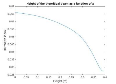 Lors de l'affinage du faisceau, on obtient une altitude approximative en fonction de sa position en abscisse en pixels, après une conversion en mètre, on obtient une altitude. Celle ci est quasiment des morceaux de constante, rendant imprécis le calcul de l'indice qui utilise la dérivée spatiale de l'altitude. On va donc réaliser un “fit” de cette altitude à l'aide d'une approximation d'un polynôme d'ordre 9 (Un tel ordre est sûrement trop grand, mais aux vus de nos approximations et erreurs parfois grossières, cela nous permet de nous exonérer d'une source d'erreur en plus. On obtient alors un graphe pour l'indice qui ne semble pas incohérent.