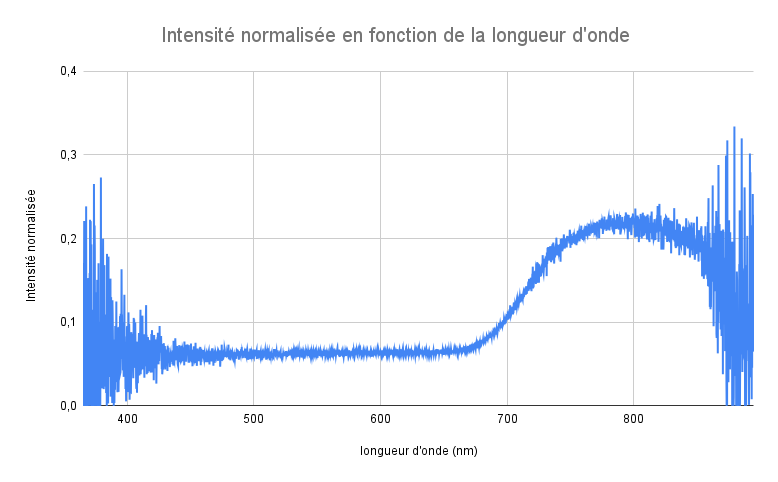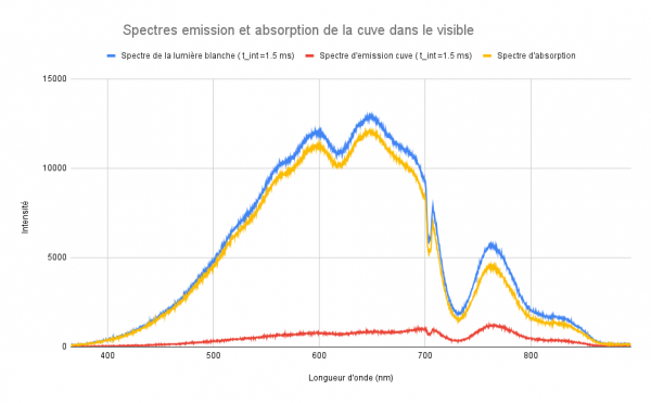 1) Les mesures du spectre d'émission d'une source de lumière blanche avec et sans la cuve permettent d'en déduire le spectre d'absorption de la cuve dans le visible. On observe un minima vers 730nm et, pour des longueurs d'onde supérieures à 860nm, soit dans le proche IR, on observe une absorption presque nulle.