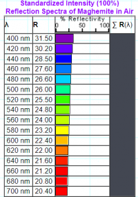 D'une part, le site web mineral[1] nous donne des propriétés physiques, chimiques et optiques de la maghémite (γ-Fe2O3). Le tableau ci-dessous nous donne la réflectivité, en termes d'intensité, de la maghémite en fonction de la longueur d'onde dans l'air.
