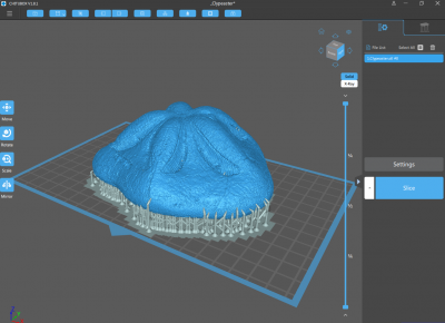 Après plusieurs essais le protocole optimal s'est avéré être le suivant : -Disposer les fichiers .stl sur le logiciel Chitubox V1.8.1 puis y mettre des supports et enfin “slicer” le modèle. Bien sauvegarder le fichier .ctb obtenu et écrire le volume prédit pour l'impression. Y AJOUTER 50 % DE SURPLUS. L’impression devrait durer entre 5 et 9 heures indépendamment du nombre de spécimens par plaque, le seul paramètre influençant le temps d’impression étant la hauteur maximale du plus haut spécimen (les mettre à plat pour minimiser).