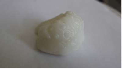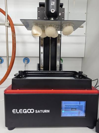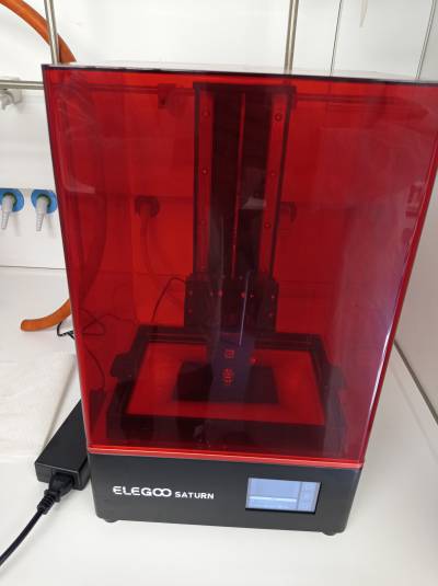 Un autre type d'impression 3D a été expérimenté : l'impression avec résine Esun white et anycubic black sur Elegoo saturn. Le principe est qu'un rayonnement ultraviolet (~450 nm) va venir de sous le bac d'impression pour durcir une zone précise de la fine couche de résine sous le support qui va monter petit à petit, faisant émerger le modèle à l'envers en quelques heures.