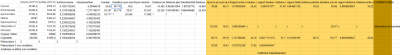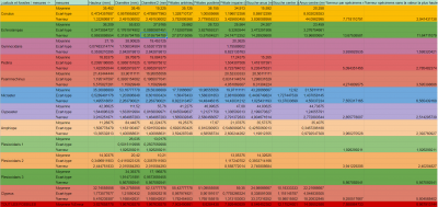 Tableau des mesures prisent sur les modèles (cases blanches) et les fossiles (cases jaunes) (obsolète, voir ci-après)