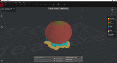 Quelques problèmes dans les impressions sont survenus, un modèle sur deux en moyenne ne parvenant pas à complétion. Cela peut-être la conséquence d’une réserve de PLA trop faible sur la machine ou de dysfonctionnements inconnus impliquant le fonctionnement à vide de la buse, le décollement du spécimens, etc. Ces anomalies très fréquentes ont entraîné ultimement l’arrêt des impressions, d’autant plus que les résultats n’étaient pas convainquant, beaucoup de détails par rapport aux modèles étant perdus. Nous soupçonnons que l’orientation souvent verticale des modèles est en partie responsable des défectuosités d’impression, cette orientation ayant été choisie afin d’obtenir une aussi bonne qualité que possible dans les zones d’intérêt phylogénétique (la base et le sommet de l’impression étant en forme d’escalier). Enfin, un problème relativisant l’idée de perte d’information lors de l’acquisition : les fichiers .stl produits sont extrêmement lourds (300000 ko à 1400000 ko…), si lourds que les ordinateurs de l’espace prototypage (32-33 1er) ne sont pas assez puissants pour les manipuler. Les réglages, si de tels modèles venaient à devoir être imprimés via Ideamaker et Raise Pro 3D, seraient plus rapidement faits depuis l’ordinateur de l’espace imagerie (56-66 3ème).