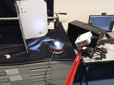 L’acquisition 3D des fossiles s’est faite grâce au matériel et au logiciel DavidScan3. Il s’agit d’une caméra doublée d’un projecteur montés sur une règle elle-même fixée sur un trépied. Ce montage est placé en face d’un plateau tournant pouvant être réglé sur le logiciel (nombre de photos par tour). Sur le plateau tournant est placé l’objet à scanner.