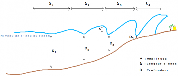 L'équation de Navier-Stokes relie ainsi l'amplitude de la vague h à la pente du fond marin.