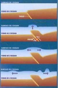 Ensuite, le planché océanique se soulève brusquement entraînant la libération d'une grande quantité d'énergie et de mouvement. Puis, une haute colonne d'eau se forme au dessus du niveau de la mer.