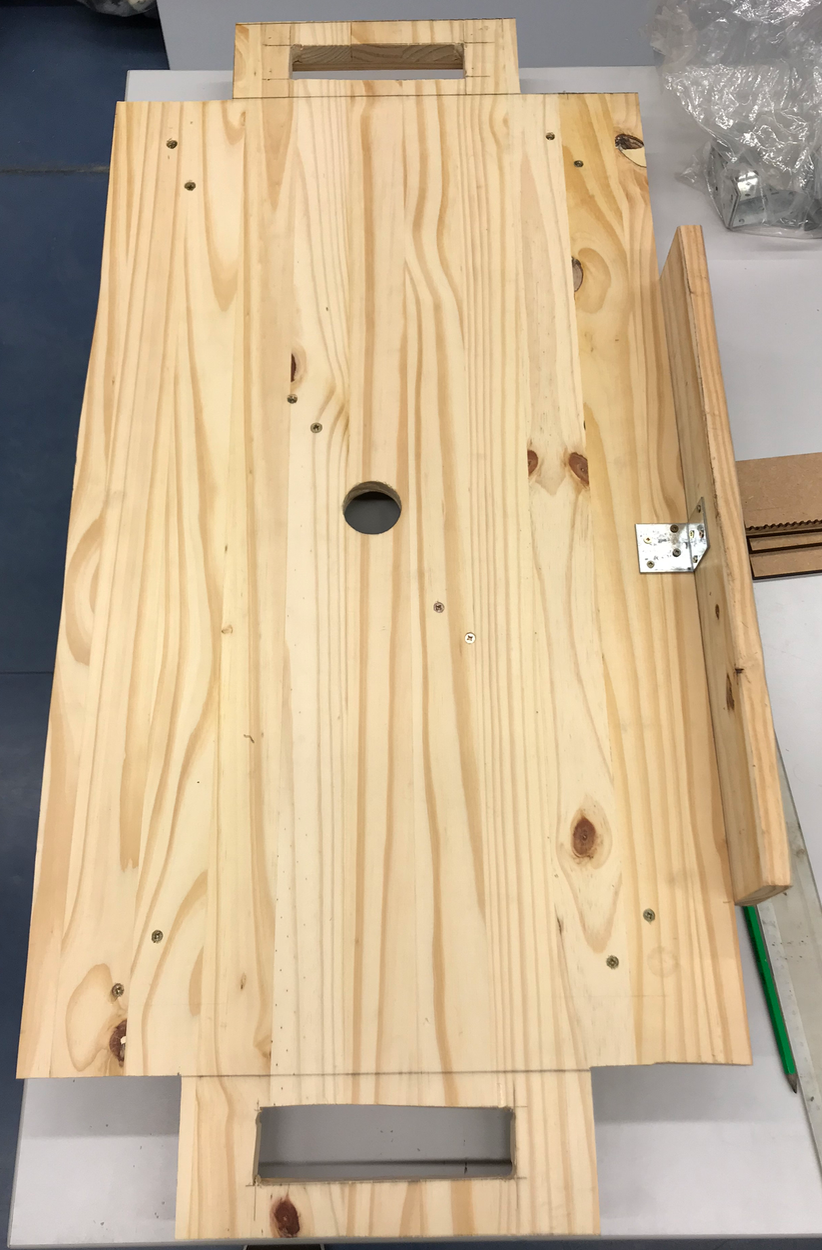 Les vis reçues étant un peu trop longues, nous avons décidé de doubler l'épaisseur du support principale en bois afin qui les vis ne dépassent pas.