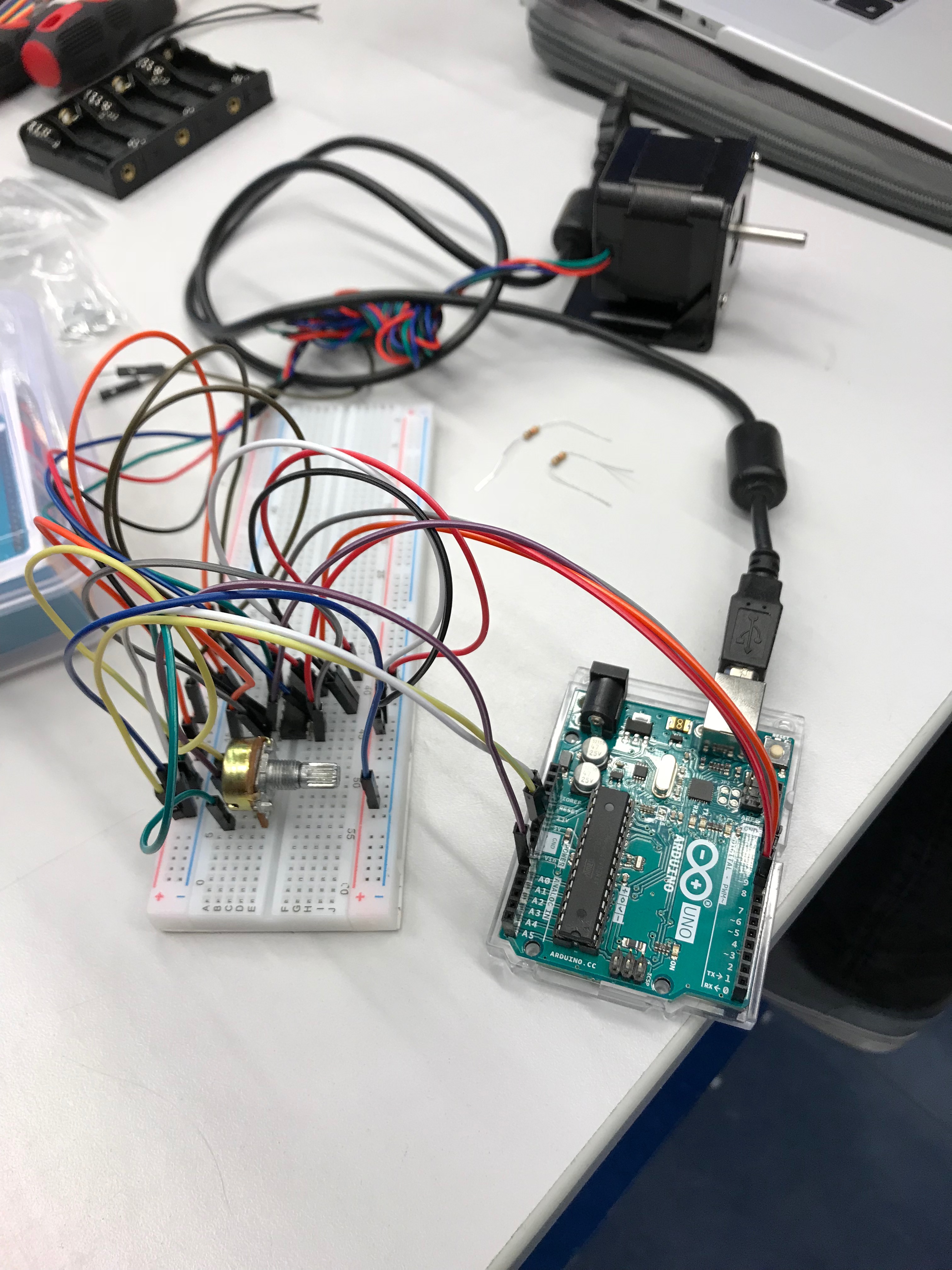 Nous refaisons le montage arduino/electronique/moteur. Nous nous rendons compte que le moteur n'est pas adapté à nos besoins. Il a besoin d'une intensité minimum pour pouvoir tourner et cette intensité le fait tourner beaucoup trop rapidement. Il ne peut pas tourner à basse fréquence. Nous nous redirigeons vers le moteur Légo du premier jour qui est un moteur pas à pas. Nous faisons aussi le montage des engrenages Légo pour ralentir la rotation initiale du moteur Légo.