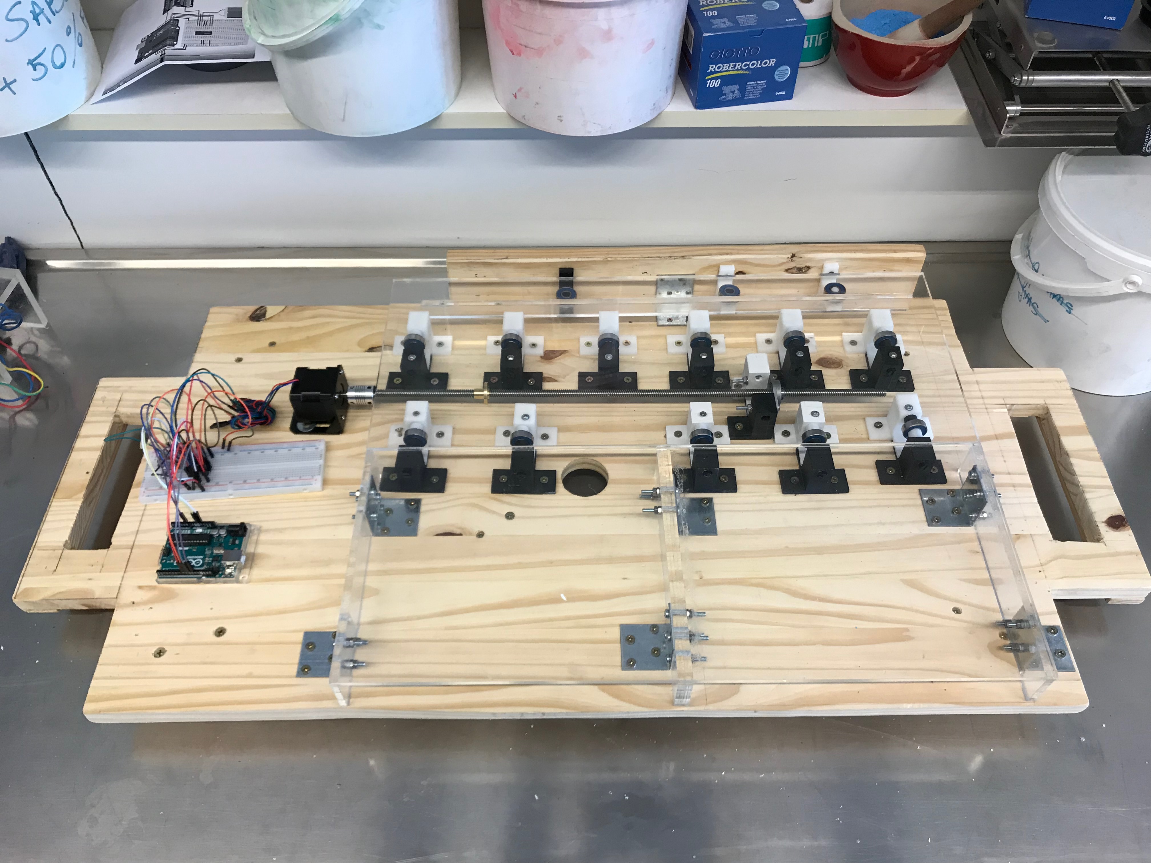 On aurait un grand support sur lequel tout serait posé et fixé. Tout doit être démontable et nettoyable facilement car les expériences doivent être réalisées avec du sable ou de l'argile. Nous pensons utiliser deux plaques de plexiglass de dimensions égales pour qu'elles soient nettoyable. Elles modéliseraient le mouvement de cisaillement. Une serait fixé au support, l'autre serait mobile. La plaque mobile repose sur un système de roulements que nous devons perfectionner. Nous hésitons entre des roulements a bille ou des rails. Les rails dirigerait la plaque mobile, sensée aller uniquement dans une direction. Nous sommes pas encore sûr des roulements sur le coté (qui empercheraient la plaque de se désaxer, elle doit bien coller à la plaque fixe).
