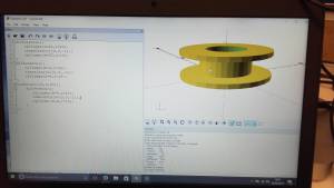 Afin d'éviter de casser l'ampli prêté par le LKB , nous avons construit une bobine à cœur magnétique faite sur mesure pour correspondre au diamètre du morceau de ferrite qui constituera le cœur de notre bobine.Nous avons utilisé le Logiciel Openscad pour concevoir le support de notre bobine que nous avons ensuite imprimé(en 3D). (voir figures ci-dessous)