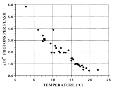 Il est à noter que la température est un facteur déterminant l'intensité lumineuse ou du nombre de photons émis représenté par le graphique suivant [1]: