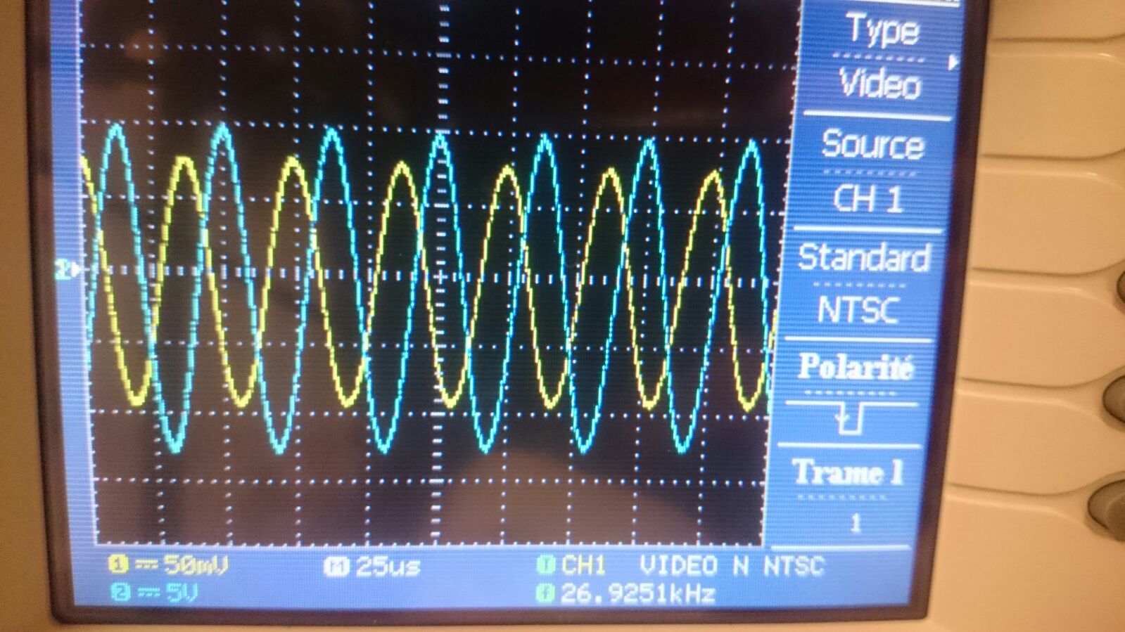 Figure 3 - Signal émis (bleu) et signal reçu (jaune), fréquence de resonnance