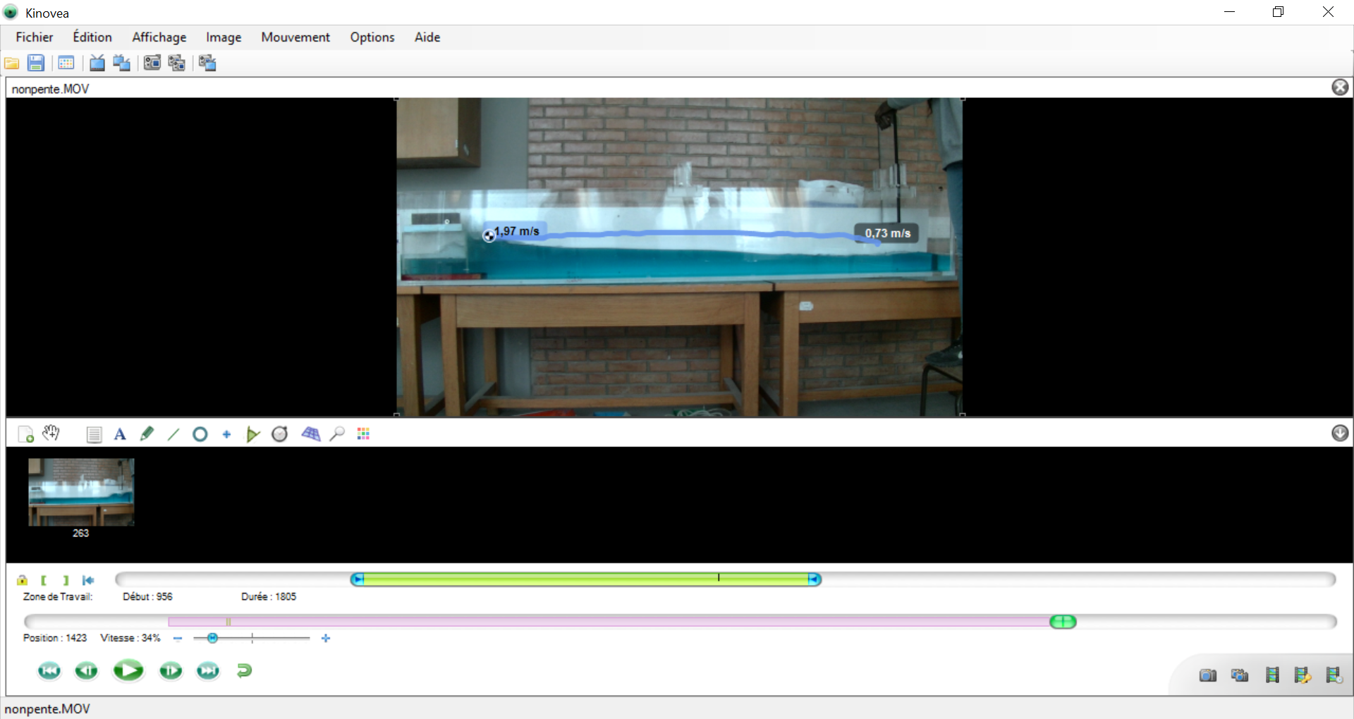 On peut décomposer le mouvement de la vague en 3 phases: * la formation de la vague: cela est du à la grande quantité d'eau qui a été rajoutée au volume initial * l'accélération de la vague : contrairement à l'océan où la vague peut se propager dans plusieurs directions, dans notre modélisation, le sens de propagation est unidirectionnel (le volume d'eau à l'origine de la formation de la vague étant à l'extrémité de l'aquarium).Par conséquence, le volume qui était bloqué par la plaque s'ajoute au volume non bloqué, entrainent une seconde accélération * la décélération: sur la pente (profondeur diminue donc), la vitesse a diminué. Cela est en accord avec la théorie qui dit que à l'approche de la cote la vitesse de la vague diminue. —- Comparaison avec la théorie: Comme noté dans la documentation, la vitesse de la vague suit 2 lois différentes: Théoriquement, la courbe que l'on doit obtenir est la suivante: Réalisation avec Matlab La vitesse diminue effectivement lorsque la profondeur du fond marin diminue. Avec notre expérience nous avons constaté cette diminution. Cependant plusieurs paramètres ont modifier les résultats théoriques attendus, notamment une profondeur d'eau peu importante par rapport au volume qui est à l'origine de la formation de la vague. —- Voici les courbes d'autres expérience avec des pentes différentes: On constate une allure similaire dans ces différentes courbes. —- Etude sur la hauteur de la vague:**