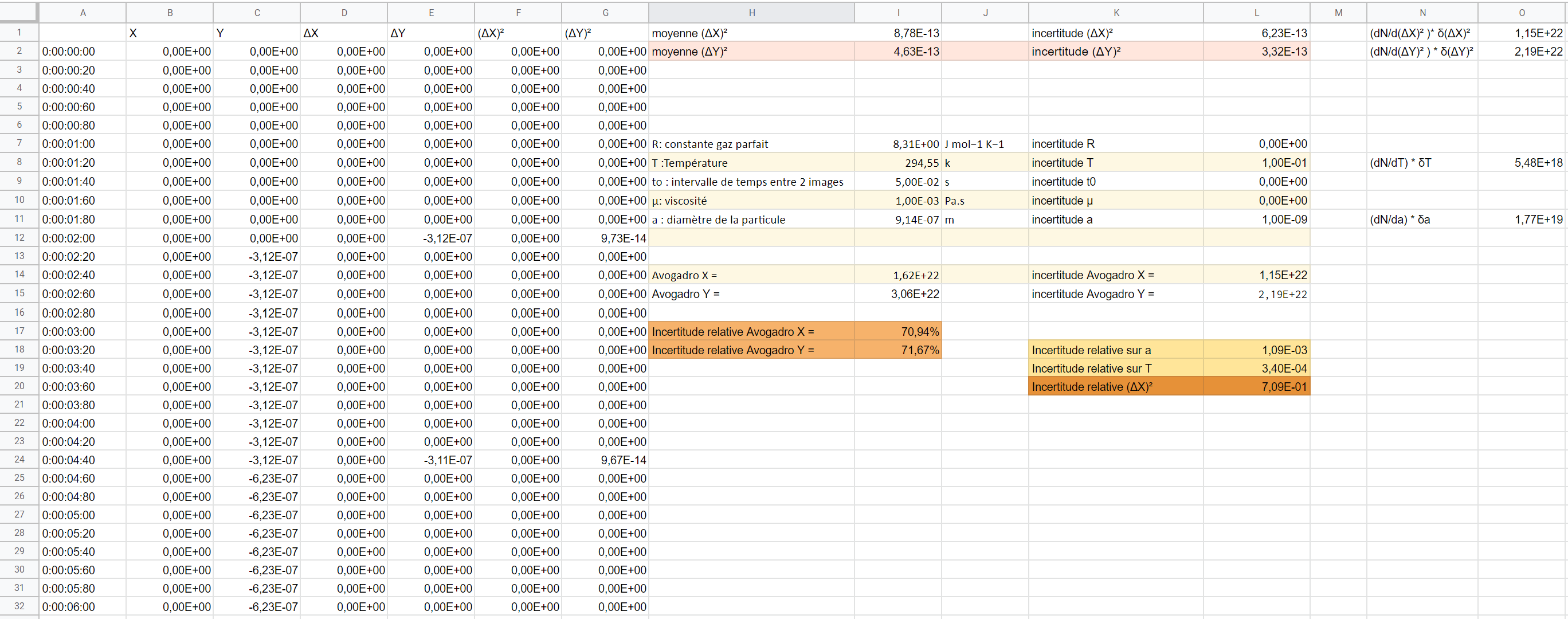 Pour traiter ces positions nous avons fait plusieurs colonnes, je vais détailler ici les calculs effectués : Les colonnes D & E correspondent à la différence de position de la particule entre les positions N+1 et N. Les colonnes F & G sont le carré des colonnes D & E. Google Sheet nous permet ensuite de faire la moyenne d'un groupe de données, nous calculons donc la moyenne des colonnes F & G Les calculs d'incertitudes sont détaillées ci-après.