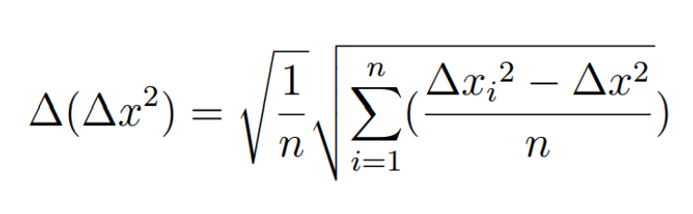 5. Enfin la dernière source d’incertitude que nous pouvons relever qui est également la plus importante est celle reliée au déplacement quadratique moyen sur x (ou sur y).(∆x^2) étant le déplacement quadratique moyen selon l’axe Ox, son incertitude est donc reliée a la valeur de l’ecart-type associé. Nous considérons en effet le déplacement quadratique moyen comme un échantillon statistique pouvant être décrit par une densité de probabilité et l’écart-type représenterait alors la dispersion des valeurs de cet échantillon. Un rappel mathématique nous donne :