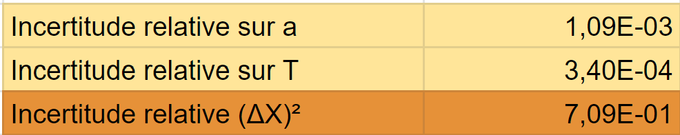 Nous obtenons donc comme valeurs pour les incertitudes relatives pour T et pour (∆x^2) respectivement :