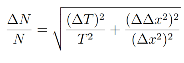 Le calcul de l'incertitude relative sur la nombre d'Avogadro se calcul grâce à une formule de propagation d'incertitudes qui stipule que l'incertitude sur une variable f correspond à la somme quadratique des incertitudes relatives sur chacune des variables dont dépend f (ici en l'occurence la température T et le déplacement quadratique moyen (∆x^2)). L'incertitude relative sur Na est alors de :