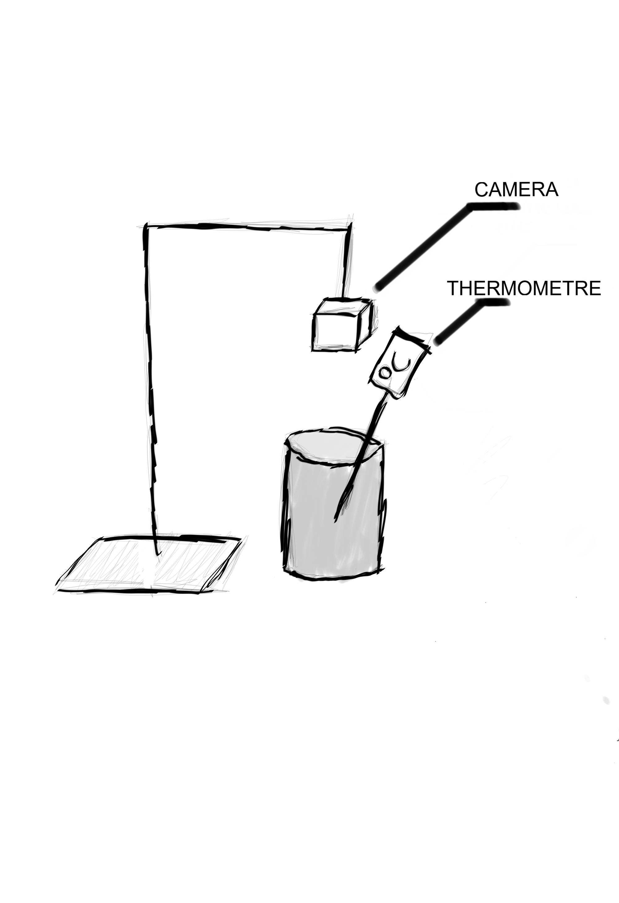 Nous avons mis en place un protocole expérimental très simple pour filmer la surface d'un bécher rempli d'eau sur lequel flottent plusieurs particules Browniennes. Les techniciens de physique expérimentale nous ont fourni une caméra microscope (x400 ; 15 fps), des billes en silicone de 1μm de diamètre , un bécher ,un thermomètre , un support pour tenir la caméra et le logiciel kinovéa pour le traitement de données de la vidéo. Schéma du montage ci dessous