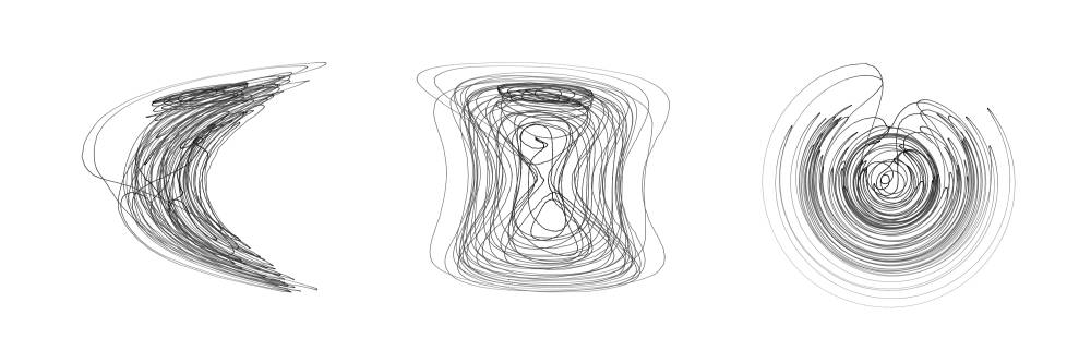 Le résultat est celui attendu, à savoir un attracteur similaire à celui de Lorenz, qui semble fractal, et présente bien cette forme en “papillon”. On observe également que pour deux conditions initiales similaires, les comportements du moulin sont similaires pendant un certain temps, mais finissent par devenir complètement différents.