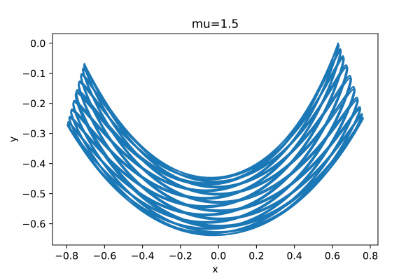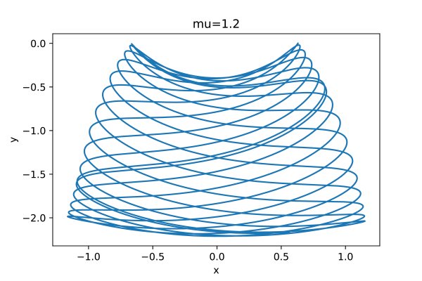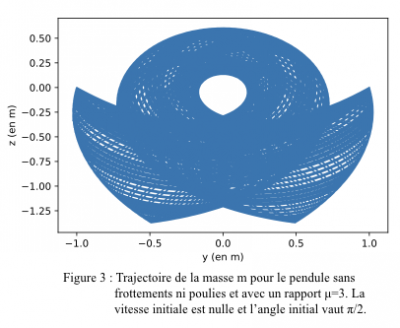 Ce premier graphique correspond à la simulation de la trajectoire du pendule idéal, en l’absence de frottements et de poulies, pour le rapport de masses $\mu=3$. En effet, pour ce rapport, le système est intégrable et il est alors intéressant d'étudier ses particularités. De plus, en le comparant avec la simulation faite dans l'article [4], on vérifie que le programme nous donne bien la trajectoire attendue.