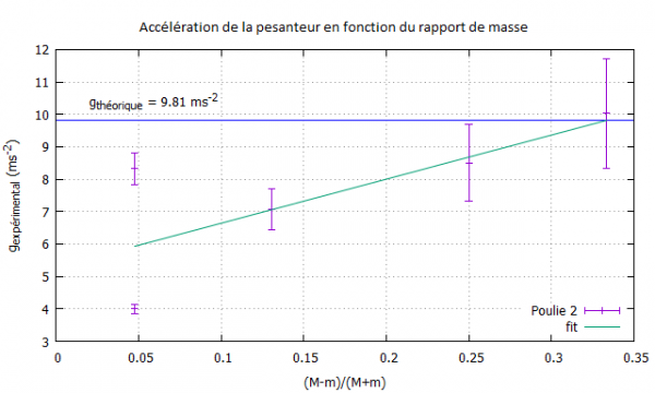 D’après l’équation $(6)$, où l'on considère uniquement la gravité, $g$ dépend de façon linéaire au rapport $\frac{M-m}{m+M}$. Pour de petites différences de masses absolues et de petits rapports de masse, la différence entre théorie et résultats expérimentaux devient frappante (on monte jusqu'à un écart relatif de $72$%) et la tendance linéaire n'est pas retrouvée. Néanmoins, on constate que nos valeurs de $g_{exp}$ commencent à se superposer à la constante $g$ pour des rapports $\frac{M + m}{M - m}\ddot{z}$ plus élevés et qu'une tendance linéaire est retrouvée. Si nous avions effectuer des mesures pour un grand nombre de rapports de masses plus élevés, nous pouvons supposer qu'un ajustement linéaire des valeurs de $g_{exp}$ aurait tendu vers la droite constante correspondant au $g_{th}$. Ici , l'ajustement linéaire que nous pouvons trouver avec les rapports de masses à un coefficient directeur beaucoup trop élevés car les valeurs de rapports de masses maximales que nous avons étudiées sont trop faibles.
