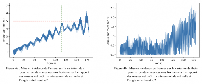 Ces graphiques nous permettent d'évaluer si les frottements de l'air sont négligeables ou non, et sur quel intervalle de temps. La simulation a été réalisée en supposant des masses rondes d'un rayon de l'ordre du centimètre. La première observation que l'on peut faire est que l'erreur faite sur l'angle est majorée par l'erreur sur $r$, on peut donc se restreindre à ne regarder que l'erreur sur $r$. On observe qu'en ne regardant la trajectoire que sur un intervalle de temps inférieur à $110$ secondes après le lancé, les frottements de l'air n'induirons qu'une erreur inférieure à $5 %$ . Ils peuvent alors être négligés en première approximation pour cet intervalle de temps.
