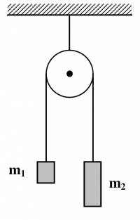 Supposant que $M > m$ et notant $T_m$ (respectivement $T_M$) la tension du fil sur la masse $m$ (respectivement $M$), le principe fondamental de la dynamique appliqué aux masses $m$ et $M$ fournit les relations