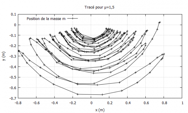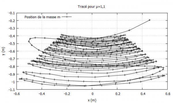 L'importance des frottements est particulièrement visible sur les deux premiers graphiques, où la courbe semble « s'écraser » aux alentours du point de coordonnées $(0,0)$, correspondant au centre de la poulie soutenant la petite masse. Les frottements freinant la petite masse, cette dernière n'acquiert pas suffisamment de vitesse, nécessaire à faire remonter l'autre masse, et voit sa trajectoire limitée dans une région proche de l'origine.