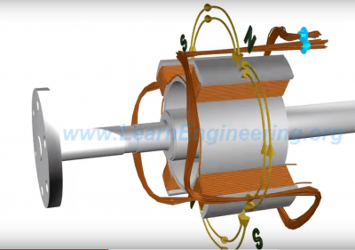 In order to have o have a better understanding lets see with juste 4 poles. Rotor coils are excited with a DC power source. Magnetic field produced around it would be shown. The rotor is made to rotate by a prime mover.