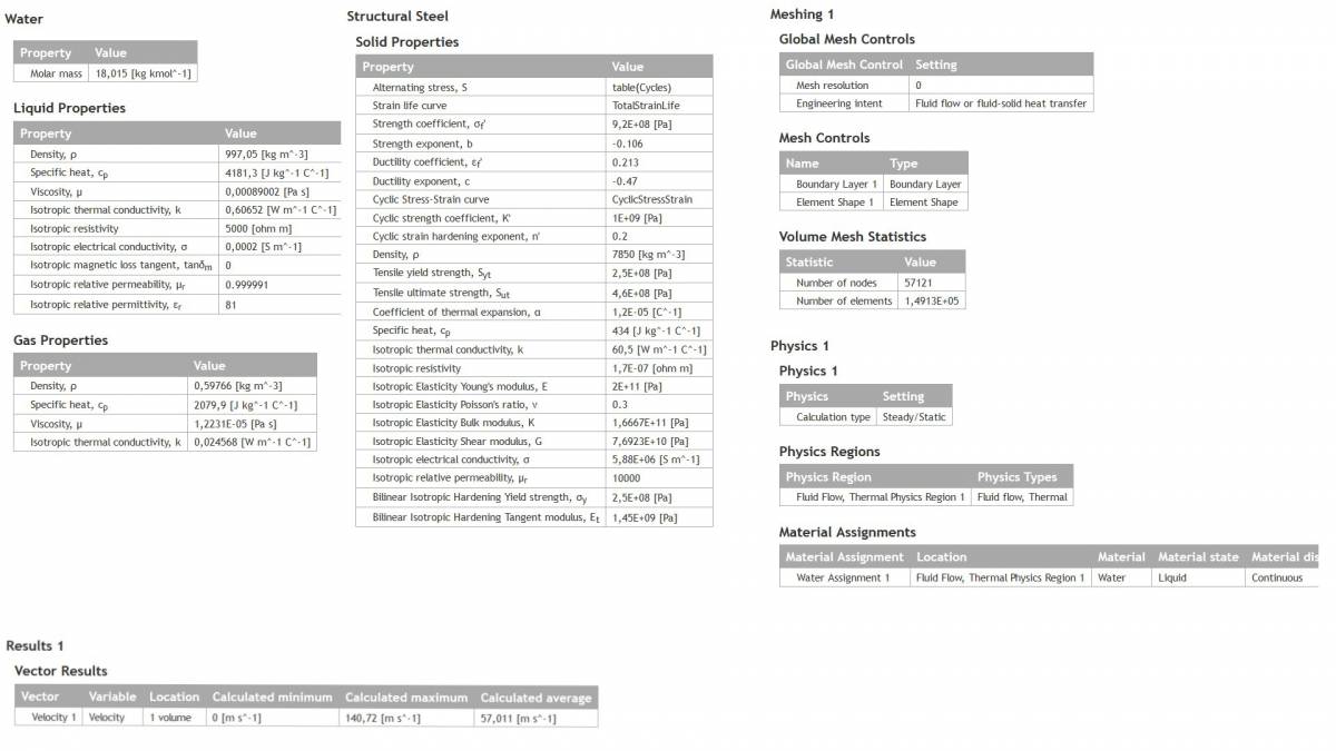 Nous avons donc entré les caractéristiques de l’expérience, en plus du modèle 3D, tels que la matière dont est faite la turbine (on a supposé de l'acier pour la version final) et les caractéristiques du fluide (l'eau en l’occurrence). On a procédé ensuite à un maillage de la turbine toujours avec le même logiciel.