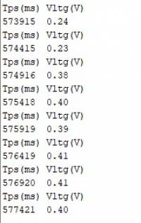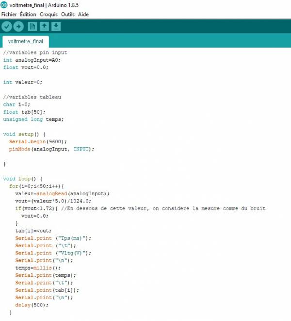 Moving on to the loop part, we first read the values sent by the analogInput pin with the analogRead function and convert them to Volts. The if loop states that if the value read is inferior to 1.75V, we will consider it as noise, wich means the real value is 0V. We then stock that value in the chart we created previously and print it in the table along with the time in milliseconds. That loop will be repeated as long as we want it to.