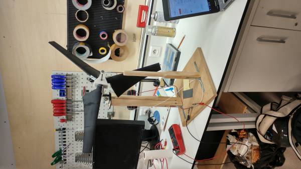 Le moteur, l'arbre de transmission et le réducteur ont été récupérés sur une voiture téléguidée. La structure sur laquelle repose l'éolienne à été conçue grâce à des chutes de bois du fablab. Nous avons du acheter 2 roulements à billes (4€) pour lier les extrémités de l'arbre de transmission à la structure. enfin pour maintenir les différents morceaux de chaque pale entre eux nous avons utilisé des tiges en métal de 3mm de diamètre et pour fixer les pales au moyeux nous avons utilisé des attaches en métal + vis.