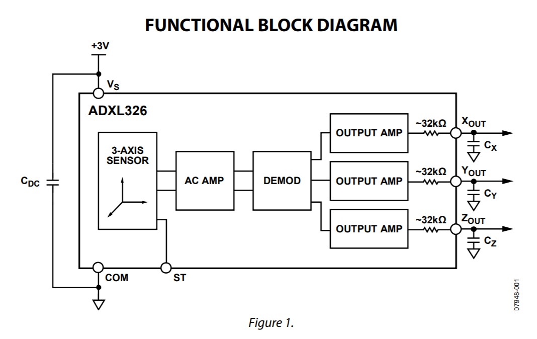 Nous avons réalisé le montage ci-contre dans le but de faire fonctionner l'accéléromètre. Cependant, nous n'avons branché que l'axe $z$ car c'est le seul pour lequel nous souhaitons mesurer l'accélération. Nous affichons l'information de sortie sur un oscilloscope, obtenant ainsi des valeurs en $volts$, mais nous les souhaitons en unité S.I. $(m.s^{-2})$. Donc, avant de pouvoir utiliser l'accéléromètre, nous devons le calibrer, connaissant la valeur de l'accélération $g$ qu'il subit et sa conversion en $volts$, nous soustrairons cette valeur afin d'obtenir une accélération nulle lorsque l'accéléromètre est au repos. Pour le calibrer, nous avons branché l'accéléromètre et avons observer la tension de sortie sur un oscilloscope lorsque l'accéléromètre est immobile, c'est à dire lorsqu'il est soumis à un accélération de valeur $1$ $g$. La tension correspondante à $1$ $g$ est de $500$ $mV$ par division à l'oscilloscope. Pour la suite, on relèvera l’accélération relative par rapport à cette position d'équilibre lorsqu'on met le pot en mouvement. Nous appliquons donc un offset de $-500$ $mV$ à l'oscilloscope pour “mettre à zéro” la valeur de l'accéléromètre.