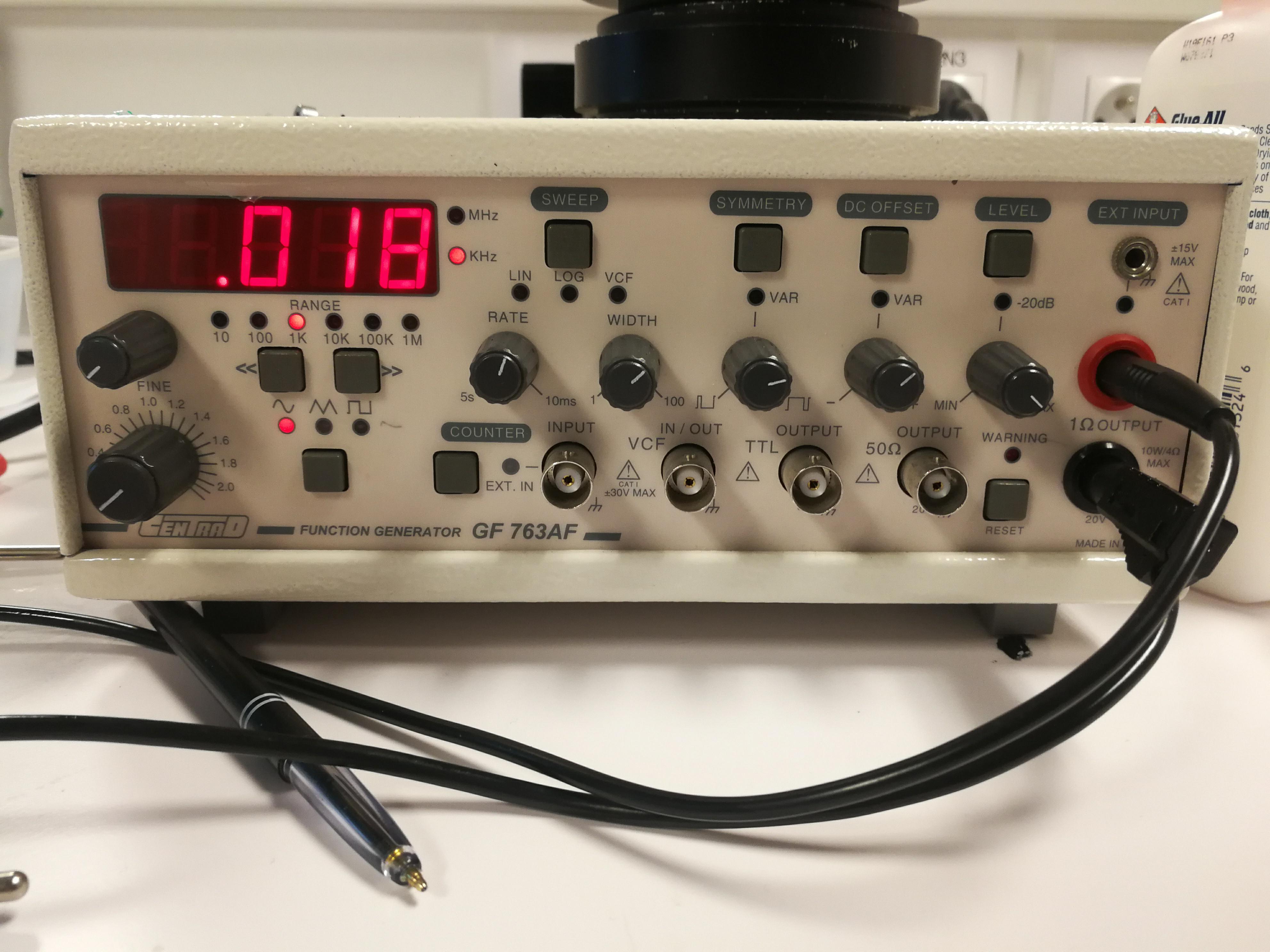 L'étape suivante consiste à brancher le pot vibrant sur un générateur à partir duquel nous pouvons faire varier la fréquence et l'amplitude de l'oscillation transmise à l'aide de fiches bananes. L'équation régissant les oscillations verticales du bain est $a_b=A*cos(ωt)$ où $a_b$ est l'accélération verticale du bain en $m.s^{-2}$; $A$ est l'amplitude de l'oscillation; $ω$ est la pulsation de vibration liée a la fréquence en $Hz$ imposée par le générateur.