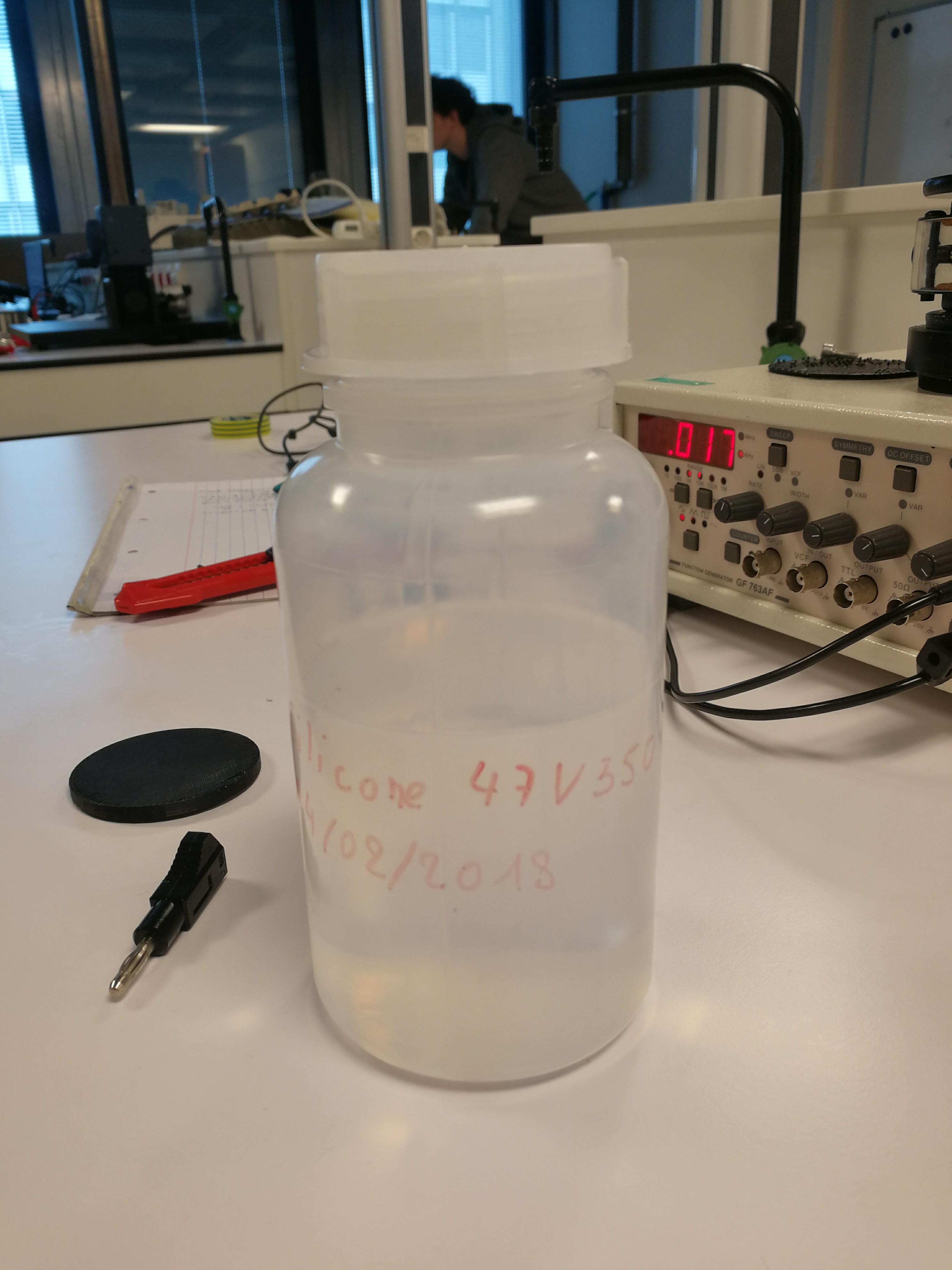 13 Février : Acquisition de l'huile 47v350 (donc de viscosité ${350*10}^{-3}$ $Pa.s$) auprès d'un technicien de l'UFR. Impression d'un socle pour le pot vibrant à l'imprimante 3D au FabLab.