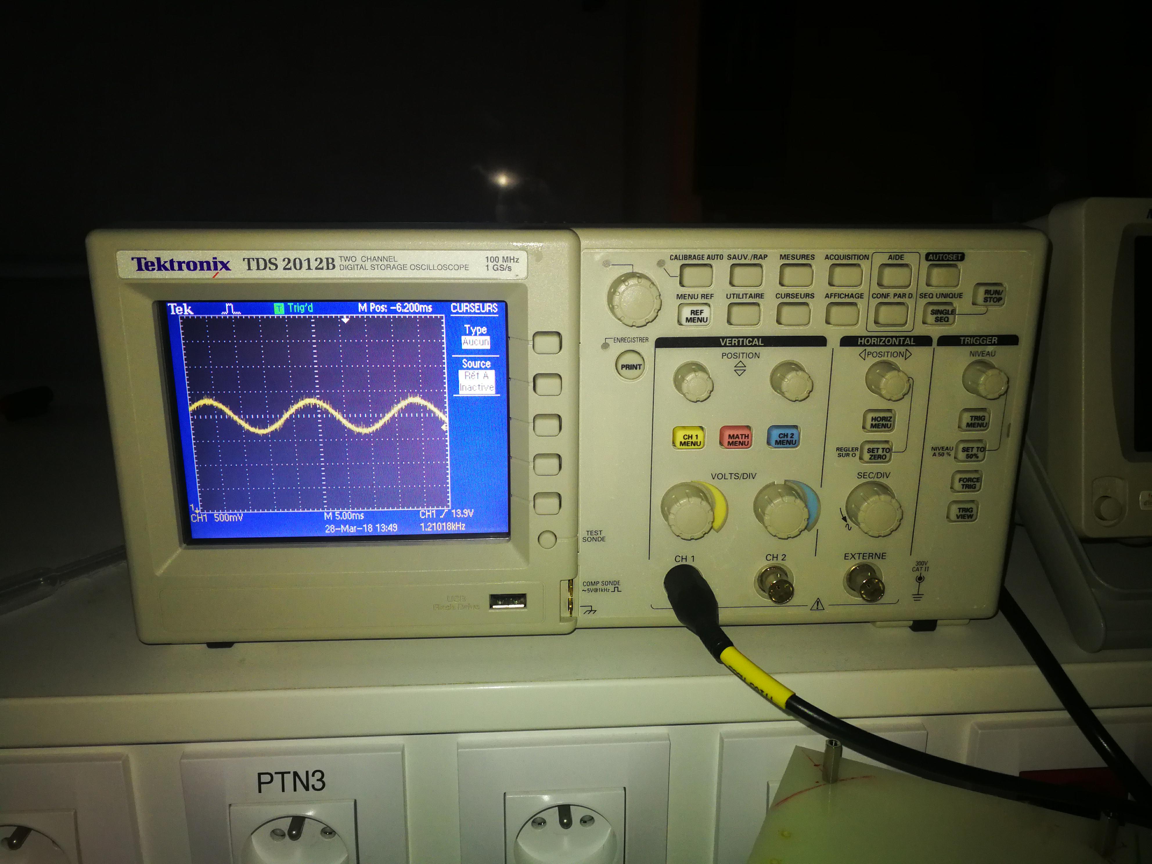 16 Février : Acquisition d'un oscilloscope TDS 210, d'un générateur basse fréquence et d'adaptateurs pour brancher l'accéléromètre. Réalisation de tests pour l'accéléromètre sans succès. Nous pensons à utiliser une huile de viscosité différente (typiquement de l'ordre de ${50*10}^{-3}$ $Pa.s$) car les paramètres de l'expérience pour cette valeur de viscosité sont référencées dans les documents à notre disposition (voir sources). Nous avons toutefois optimisé le montage de la veille utilisant l’huile 47v350 en changeant simplement le domaine de fréquences (entre $19$ et $21$ $Hz$ cette fois-ci).