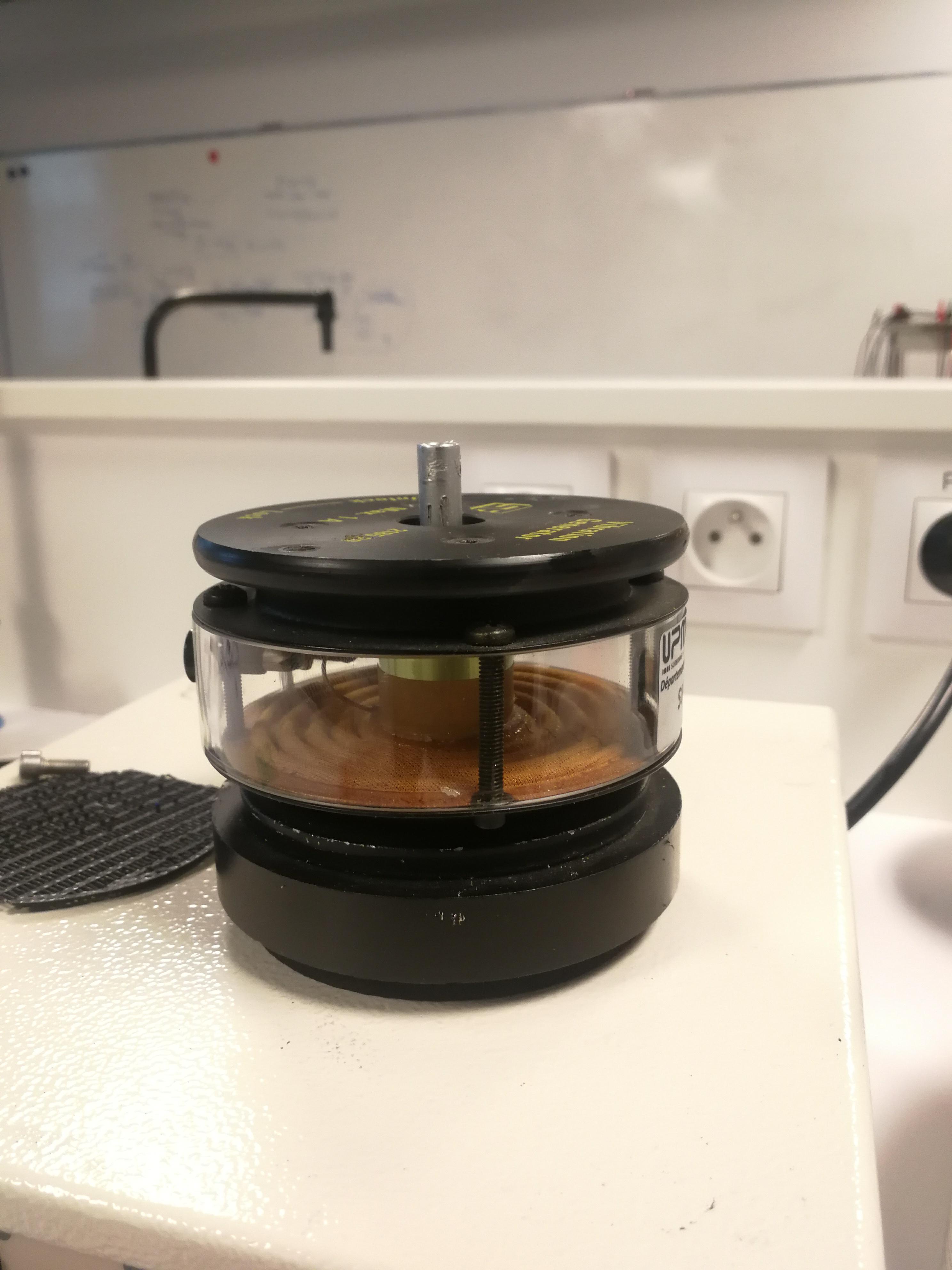 La première étape de l'expérience consiste à poser le socle imprimé à l'aide d'une imprimante 3D sur le pot vibrant. Nous avons ainsi attaché le récipient recueillant l'huile silicone au socle à l'aide d'un scotch double face afin de le maintenir en place tout au long des manipulations. Après avoir récupéré un nouveau socle plus large pour accueillir l'huile, on a remplacé celui de l'ancien montage avec celui-ci.