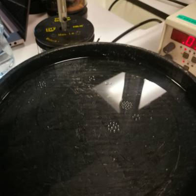Lors de l'expérimentation, en présence d'un assez grand nombre de gouttes, un phénomène particulier a fait son apparition. En effet, les gouttes se sont rangées en un ensemble compact avec les gouttes disposées à équidistance l'une de l'autre. Ce réseau cristallin se réarrange dès lors qu'une goutte passe à proximité.