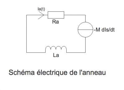 L'anneau (consistant simplement en un enroulement de spires, comme une bobine) est donc modélisé par une inductance propre, une inductance induite qui fait office de source de courant (courants de Foucault) et une résistance qui dissipe de l'énergie par effet Joule.
