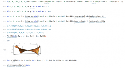 En y regardant de plus près, ces singularités ont lieu pour des valeurs bien définies : +-Pi sur l'axe plotté verticalement et +-a (rayon du cylindre) sur l'autre axe. On pourrait étudier les zéros de l'intégrante pour vérifier.