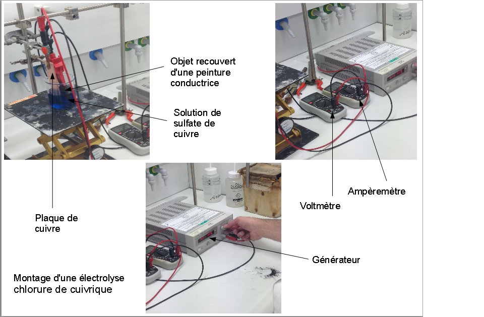 Nous pouvons voir ci-dessous le matériel et le montage utilisé pour le dépôt électrochimique du cuivre sur un objet initialement conducteur: