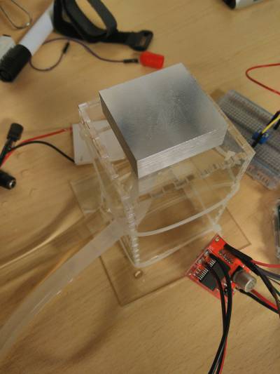 Le circuit d'eau est compliquée à réaliser : il faut noyer totalement la pompe, à la fois en entrée et en sortie pour arriver à chasser l'air du circuit. Aussi, j'ai utilisé un bac de rangement, rempli d'eau pour faire réservoir.